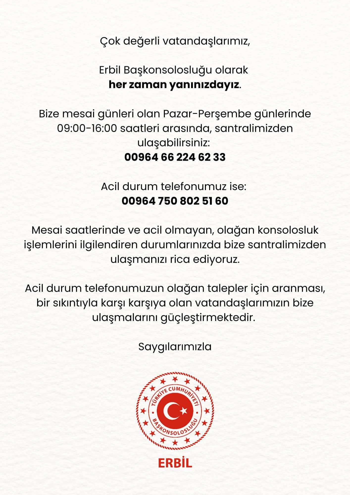 Bu bilgiler bize ulaştığında, ilgili IKBY makamlarıyla derhal temasa geçerek, vatandaşlarımızın can güvenliğinin sağlanması için gerekli tüm tedbirlerin alınmasını temin etmekteyiz.
